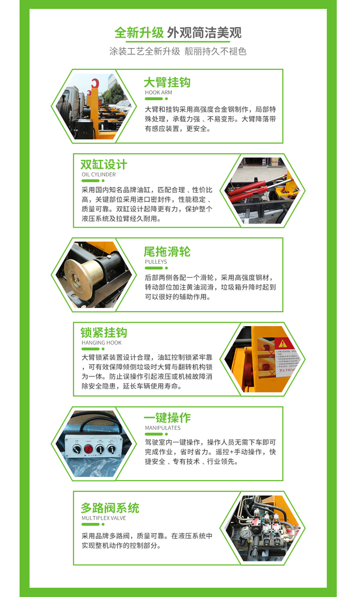 上裝配置:由液壓系統(tǒng)、操作系統(tǒng)、拉臂,組成。舉升油制缸為國內(nèi)知名液壓件廠家生產(chǎn)的雙作用油缸,多路閥液壓控制,操作員手動控制垃圾廂吊上放下,帶自卸功能,上下一次工作循環(huán)時間≤40S。標配帶液壓油箱,滑輪,液壓多路閥,拉臂油缸,鎖緊油缸,液壓油過濾器,液壓油泵,液壓表等部件組成。選配液壓支腿。